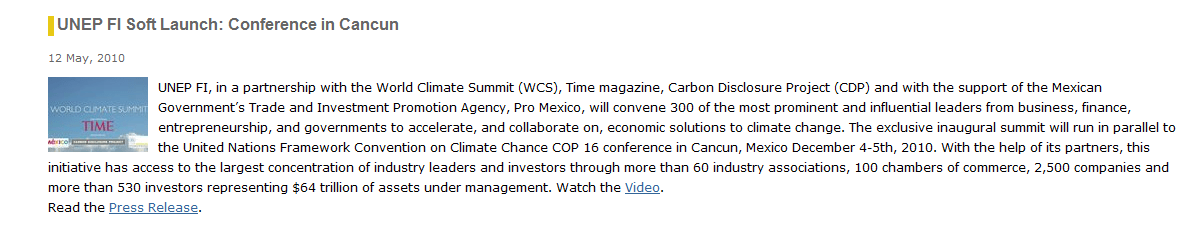 Ceres’s INCR is a founding industry partner of The World Climate Summit (WCS) (2010) [1], now operating under the auspices of World Climate Ltd, a private company registered in England and Wales (No. 07186968) [Doha: World Climate Summit 2012 | 2012 Partners] WCS founding partners include the planet’s most powerful corporations and institutions with access to more than 60 industry associations, 100 chambers of commerce, 2,500 corporations, and more than 530 investors representing more than $64 trillion in assets under management. [See screenshot below: UNEP FI Soft Launch: Conference in Cancun]