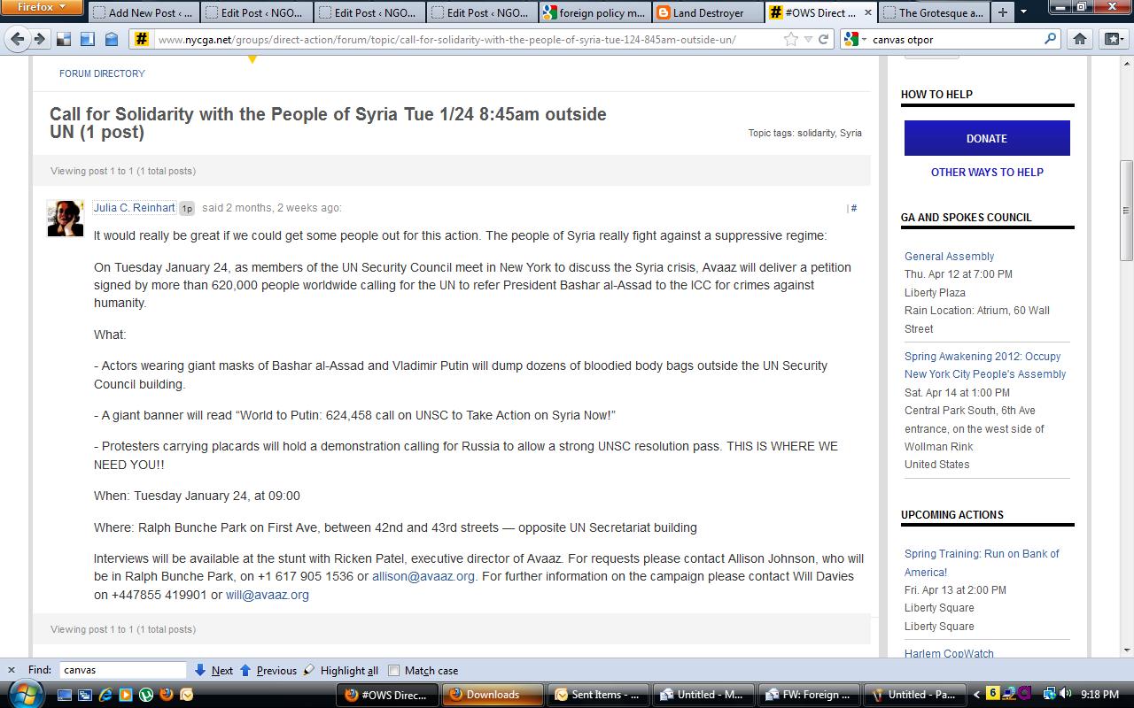 Image on far left: In 1998 the Otpor logo appears in Belgrade. Image on left: Otpor logo as found on the New York Occupy Wall Street Official website (2012), featured above an Avaaz destabilization campaign against Syria. (screenshot below). Read more about Avaaz here.