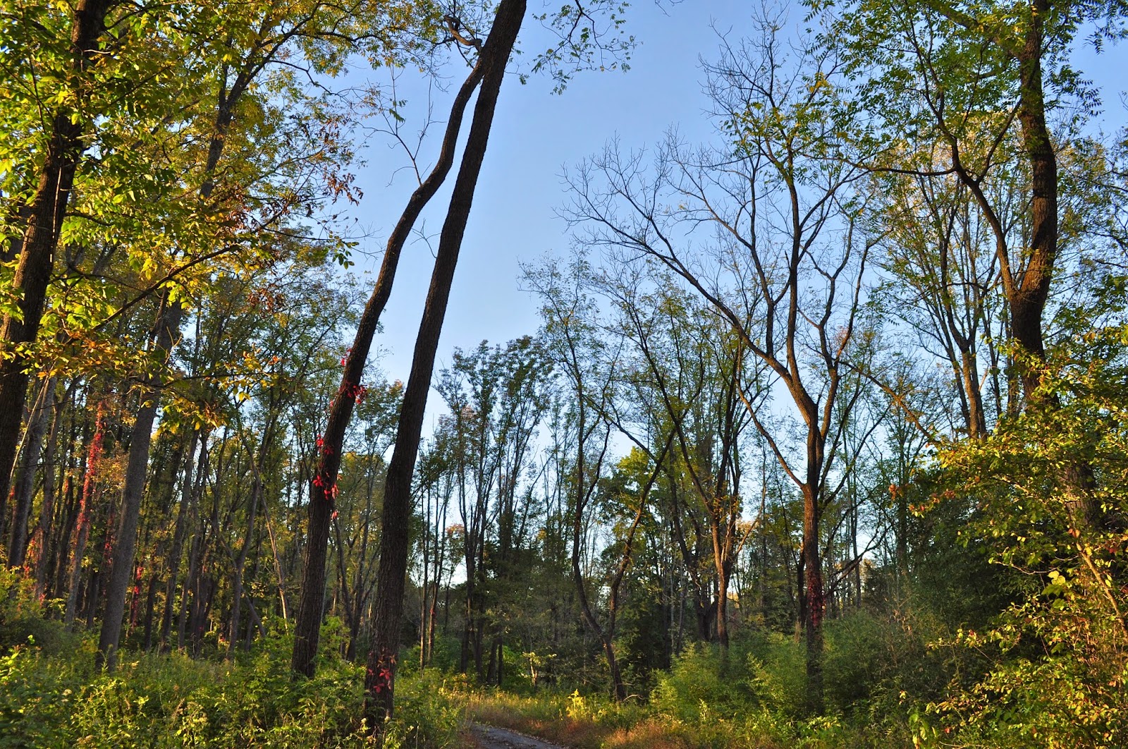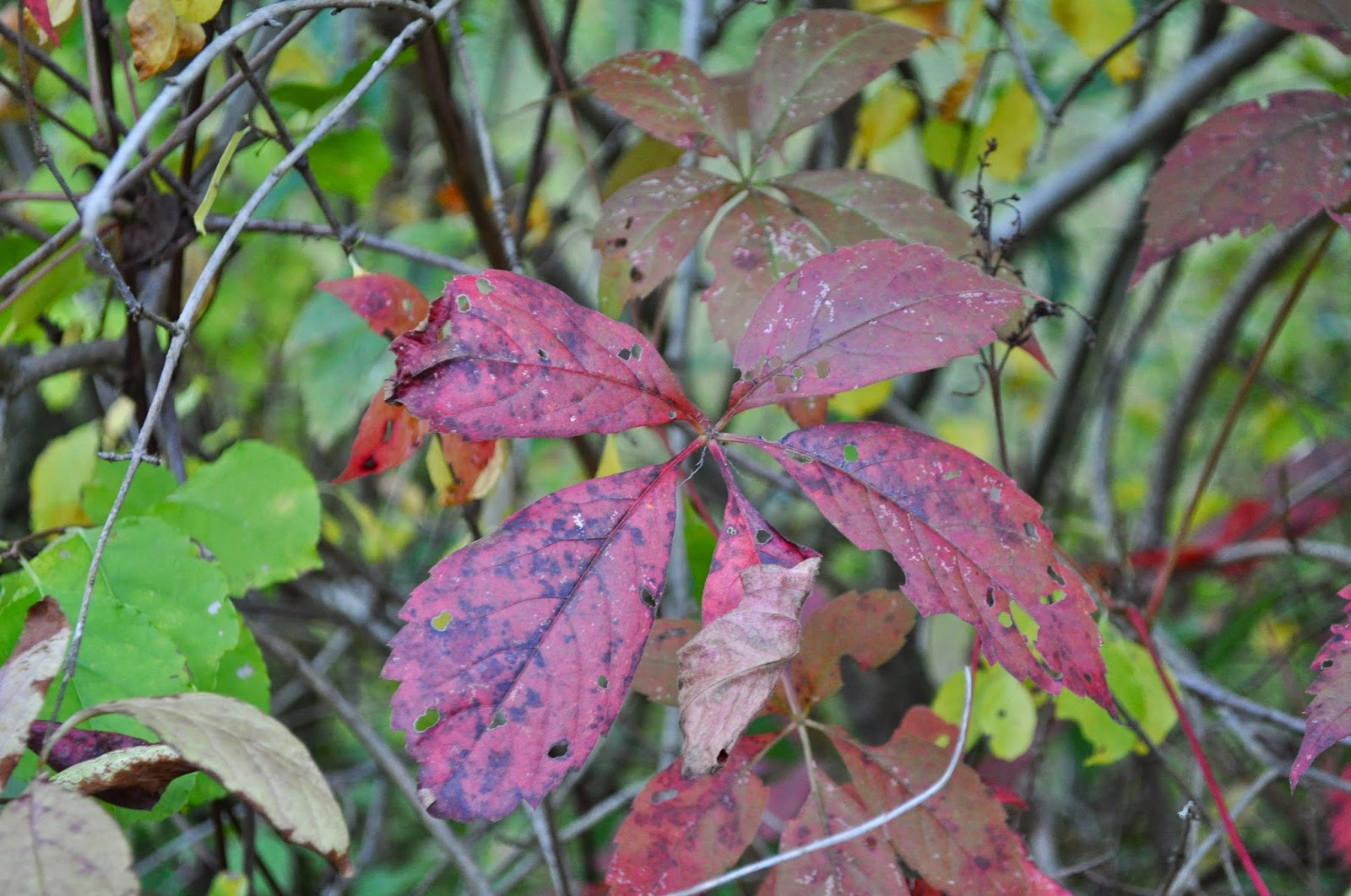 The Virginia creeper lit by the setting sun into a bright scarlet from a distance actually looks dreadful close up.