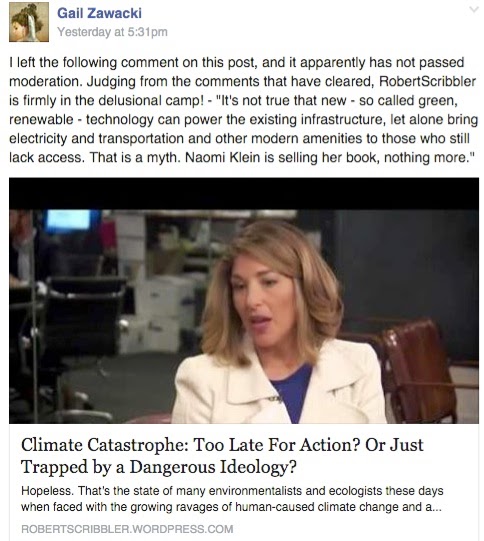 This strategy has always struck me as an epic failure, since climate change is only one symptom of a more general, lethal overshoot. The single-minded focus on carbon emissions over other issues, such as pollution, habitat destruction, and overextraction of everything from lumber to fish to minerals simply enables more of the same destruction to proceed even as it pretends to challenge the status quo, Naomi Klein and Chris Hedges notwithstanding. In fact their supposedly more radical critique of capitalism is a red herring, and an insidious deflection of the true dimensions of the tragedy of the commons that has ensnared humans into ecocide. Underlying their exhortations to change or even dismantle the economic system is the false belief that “green energy” will ensure free pizza forever. While chants like “We are Unstoppable, Another World is Possible” and “Put up Your Fist, Resist, Resist” are rousing good fun, really, as Candide would say, we ALREADY are in the best of all possible worlds…as in, it ain’t gonna get any better than this…and there is no obvious way to resist OURSELVES. Here’s all you need to see of Naomi Klein and her own special brand of bullshit. (Well, hey, it sells books, apparently.) [update: OMG this is too funny. This video has been taken down – in it, Klein is interviewed on HuffPo saying that so many people have reacted to her book by saying IT’S TOO LATE. I guess that message was too scary so the record has been deleted. TOO hilarious!]