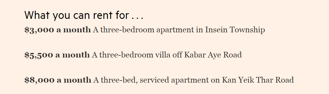 Neoliberalism would soon follow. In 2012, Woodhouse would relocate to central Yangon “to settle as a social development specialist for the World Bank, which was re-engaging with Myanmar after an absence of more than 20 years” with her spouse and Avaaz co-founder David Madden. Not so coincidentally, Myanmar’s opposition leader Aung San Suu Kyi was released from house arrest, US and EU sanctions began to lift and “market liberalisation” was under way. Between 2011 and 2015 the cost of renting a typical apartment more than doubled with landlords catering to the wave of foreign money by demanding a full years rent up front.